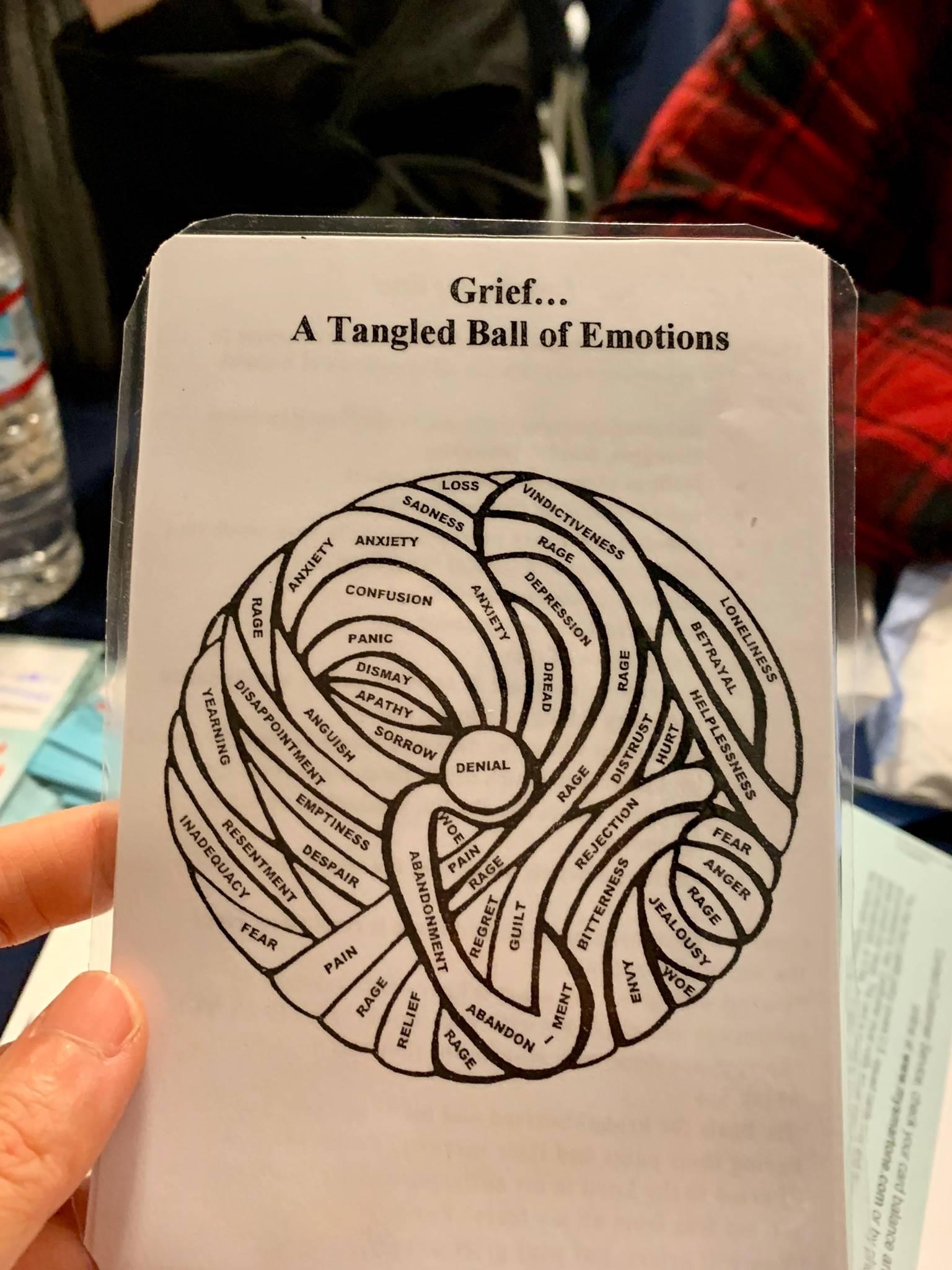 On December 1st, Gerald and Marie came to FEMA DRC to receive Tzu Chi’s emergency cash card, they sat down at my station and shared the most horrific day of their lives. Marie said, “as a chaplain I do a lot of grief counseling, I always carry a grief cheat sheet in my purse, it’s very helpful at a time like this.” She explained to me that grief is a tangled ball of many different emotions - denial, pain, helplessness, abandonment, and everything else that is negative. Marie said, “grief is a journey, it’s a process, but it has a resolution.” Marie kindly offered the laminated cheat sheet to me and said, “you can have it and use it to help the others who come here.” I took a photo of it so I can have the information but she can keep the card with her. I can tell she needs it for herself.